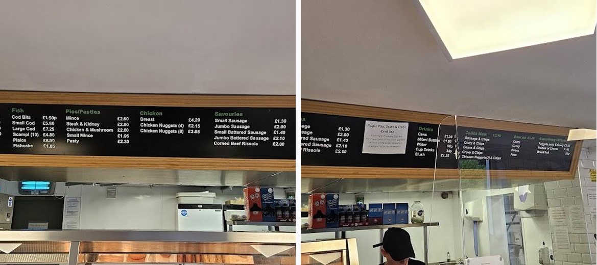 Stopped off on impulse as after a long day and no one wanted to cook. Fish freshly cooked whilst we waited. Chips light and crunchy without being greasy. Added photos of the menu as they dont seem to have any online presence so we can decide on choices in advance in future